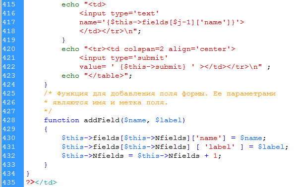 addField(). Добавляет имя и метку поля в массив $fields. Например, если пользователь добавил в форму поля для ввода имени и фамилии, то этот массив будет иметь следующий вид: