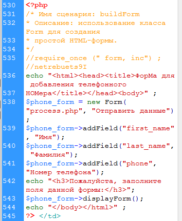 Сначала с помощью функции require_once() файл form.inc с описанием класса Form включается в сценарий. На его основе создается объект с именем $phone_form. 3aтем в форму добавляются три поля, после чего форма выводится на экран. Следует заметить, что в приведенном фрагменте использовалось несколько дополнительных дескрипторов HTML, которые можно было бы разместить и в методе displayForm ().